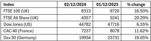 The key point here is that if we think something is happening (such as the ongoing cost-of-living issues and rising tax costs), the markets have usually factored in the effects. Looking at the markets on 01 December 2025, in comparison to a year ago, we find the following (approximate) for a range of market indices: